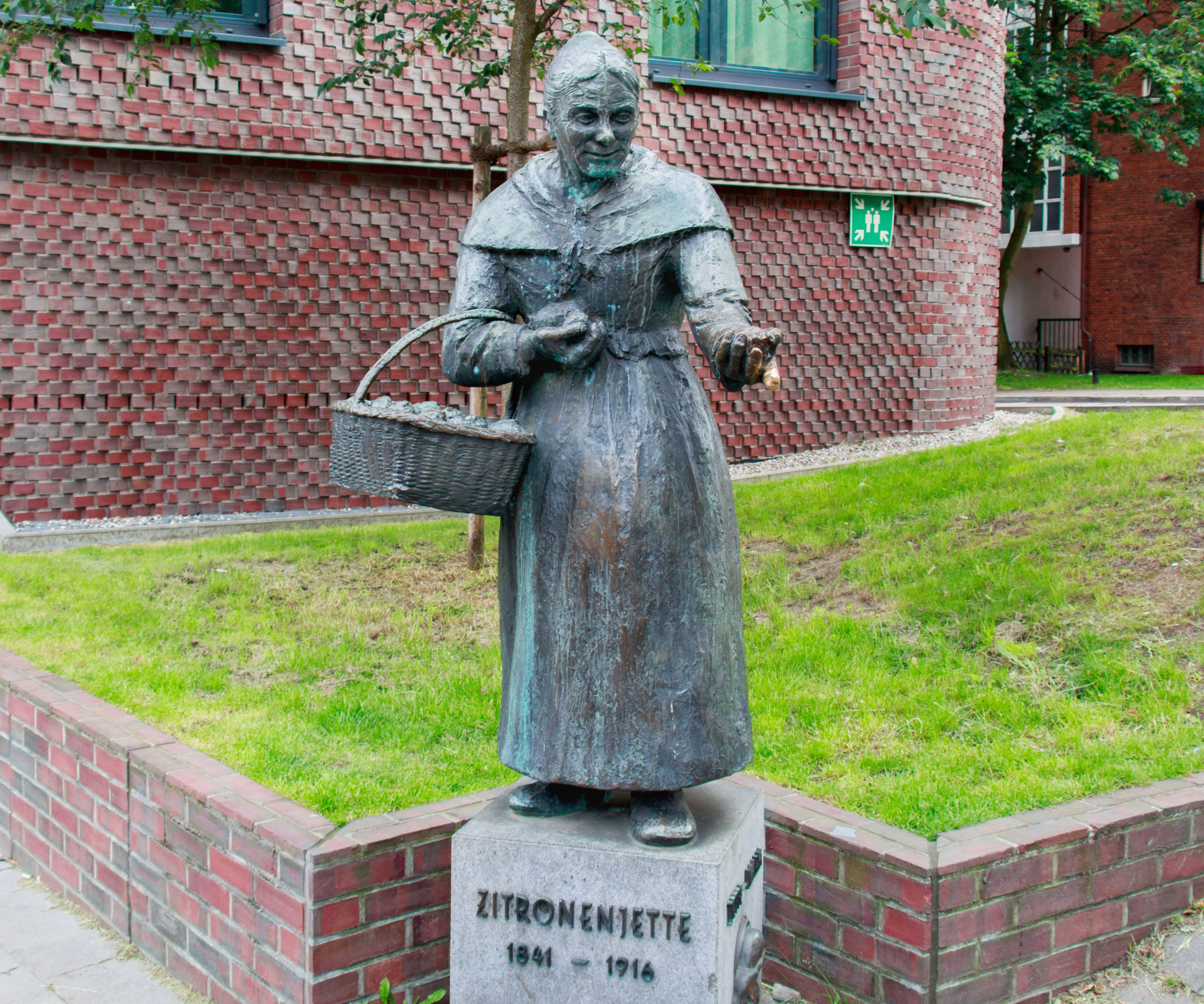 Это вовсе не выдумка скульптора. Лимонная Йетте (Zitronenjette) вполне реальная историческая личность. Звали её Генриетта Иоганна Мария Мюллер. Она проживала в Гамбурге на рубеже XIX и XX веков в самой простой, ничем не примечательной и не богатой семье. Когда Йетте была ещё малышкой родители заподозрили, что с её физическим и душевным здоровьем что-то не так. Йетте отставала от сверстников по всем статьям. Юной девушкой она достигала роста всего 132 см и весила 35 кг. Что было делать крошке? Тяжелая работа ей была не по плечу. Тогда Йетте решила торговать. Она покупала на приходящих в Гамбург судах лимоны и бродила по улицам с полной корзиной, предлагая купить экзотический фрукт всем подряд.
