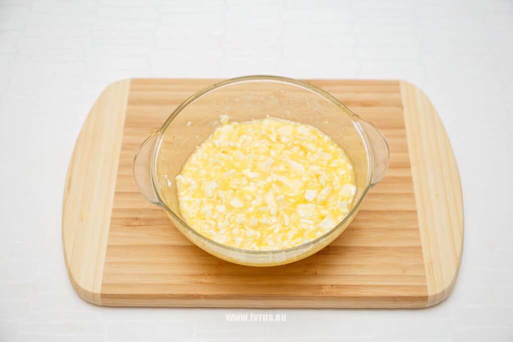 Подготовить начинку: смешать творог с яйцом и сахаром, по желанию добавить ароматизатор.
