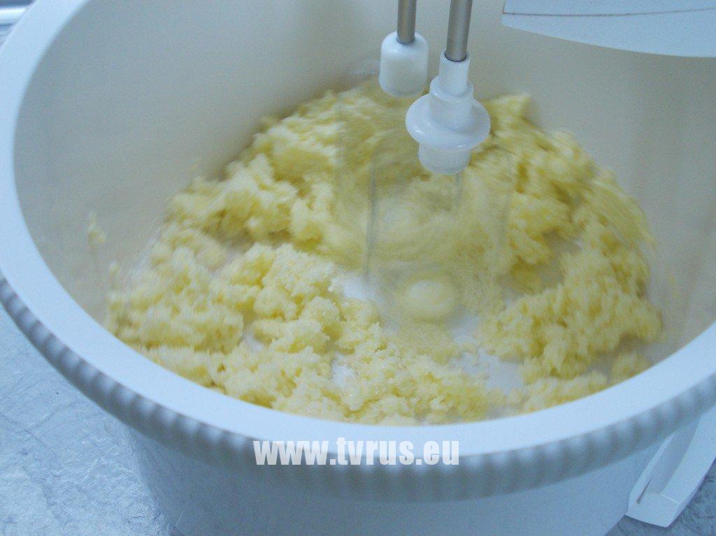 В другой чаше смешать сахар (125г) и сливочное масло (125г), взбить на средней скорости, пока масса не посветлеет.
