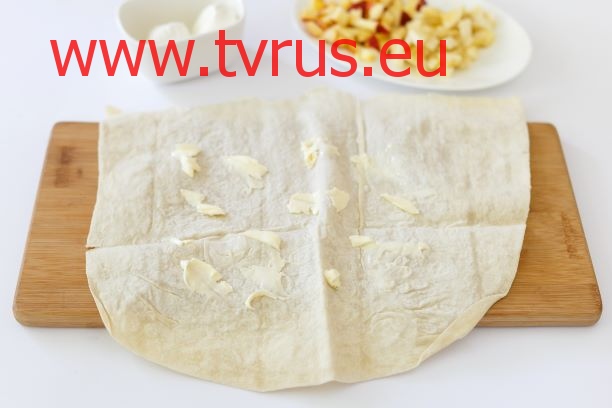 Сверху на лаваш разложить сыр рикотта, он мягкий, поэтому его можно намазывать на лаваш как масло.