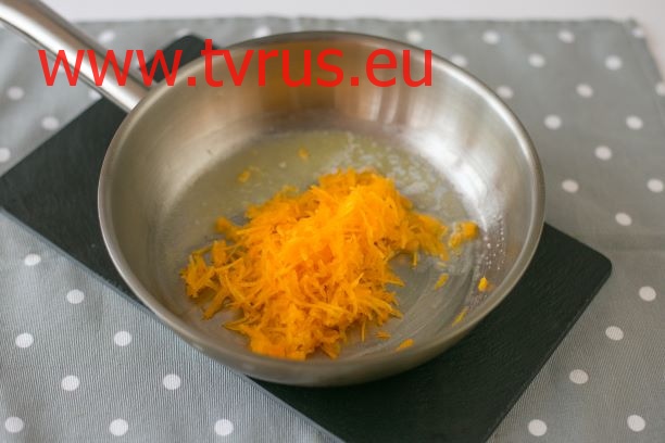 Растопить в сковороде 10-15 г сливочного масла, поджарить в нем очищенную и натертую на мелкой терке тыкву. Выдержать тыкву на огне около 2 минут, постоянно помешивая.