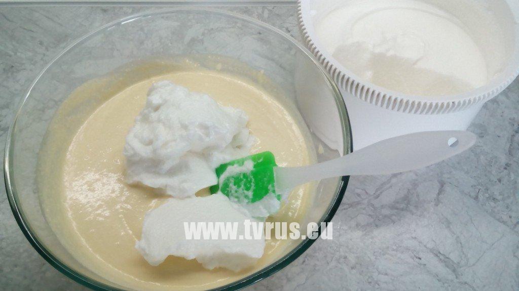 Во взбитые желтки частями ввести взбитые белки и аккуратно перемешать движениями снизу-вверх до однородной массы.