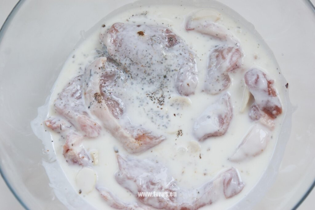 Залить мясо кефиром (йогуртом) и оставить мариноваться на два часа.