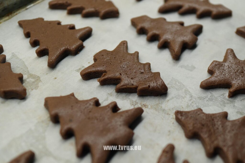 Раскатать между двумя листами пергамента до толщины 0,5-0,7 см и с помощью формочек вырезать пряники. Выпекать на застеленном пергаментом противне 7-10 минут при 170°C.