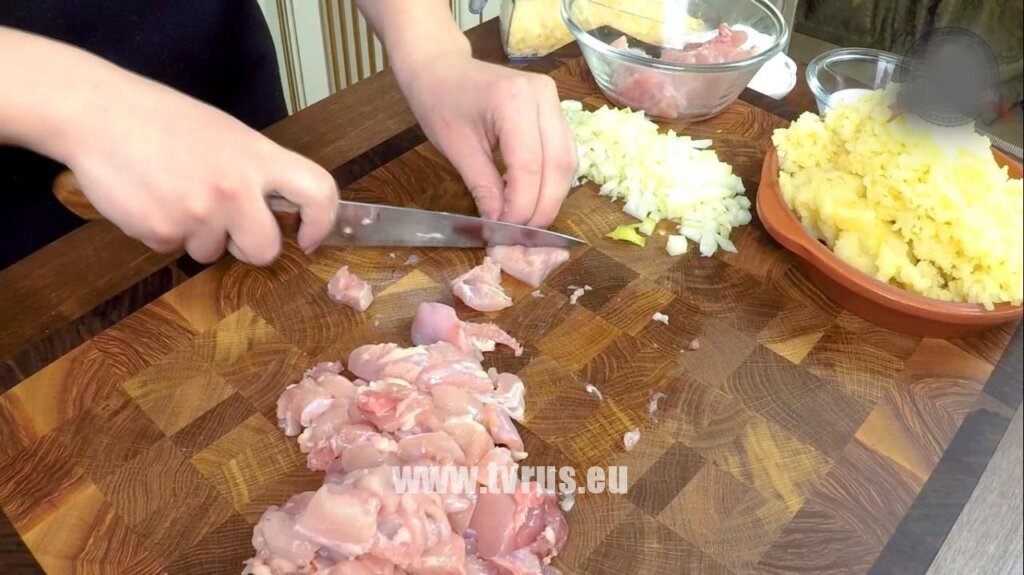 Филе куриного бедра нарезать на мелкие кусочки размером с грецкий орех. Курицу можно спокойно заменить индейкой или, например, свининой.