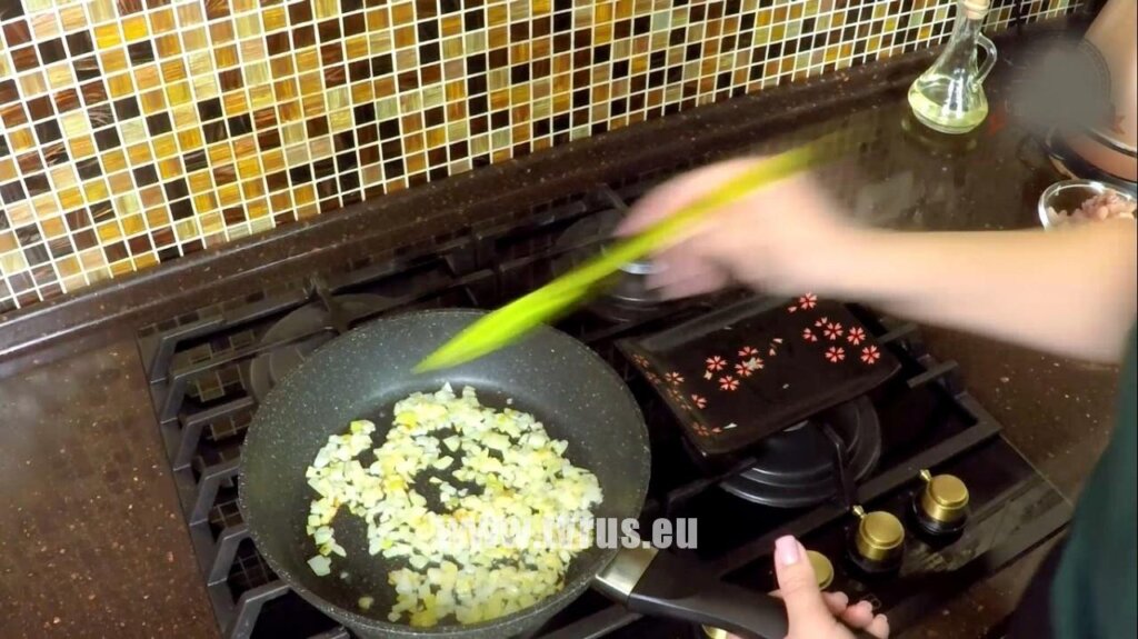 В сковородку залить 1-2 ст. л. растительного масла. Обжарить лук до румяного цвета. Переложить лук в отдельную емкость.