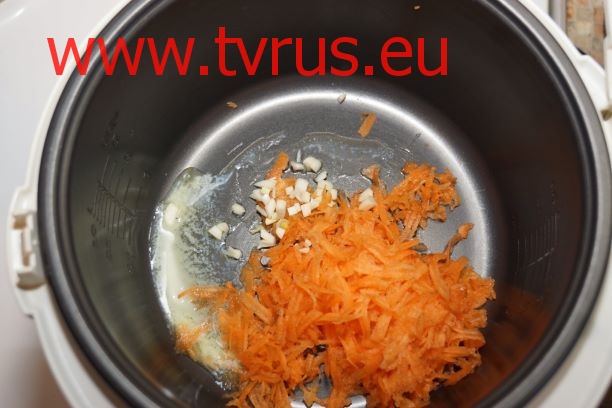 Морковь натереть на средней терке, чеснок мелко порубить. Обжарить в режиме «Выпечка» на растительном масле 10 мин.