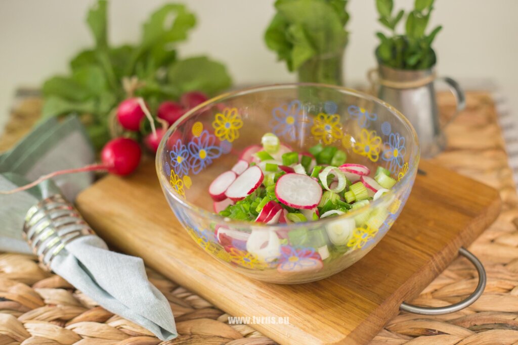 Пока варятся яйца, нарезать тонкими кружочками редис, а также порубить перья зеленого лука, смешать ингредиенты в салатнике.