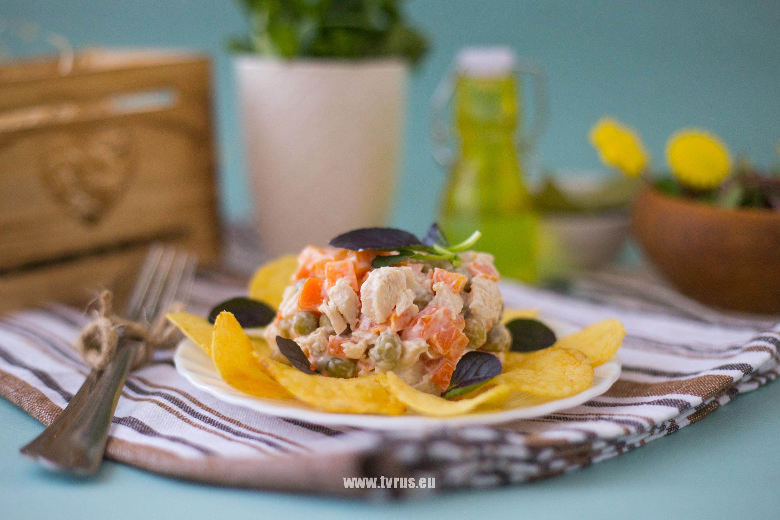 Заправить салат майонезом. Для оформления использовать крупные картофельные чипсы.