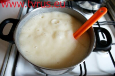 3. Затем поставить на средний огонь и варить постоянно помешивая до золотистого цвета (т. е. как начнёт темнеть) выложить сгущенное молоко