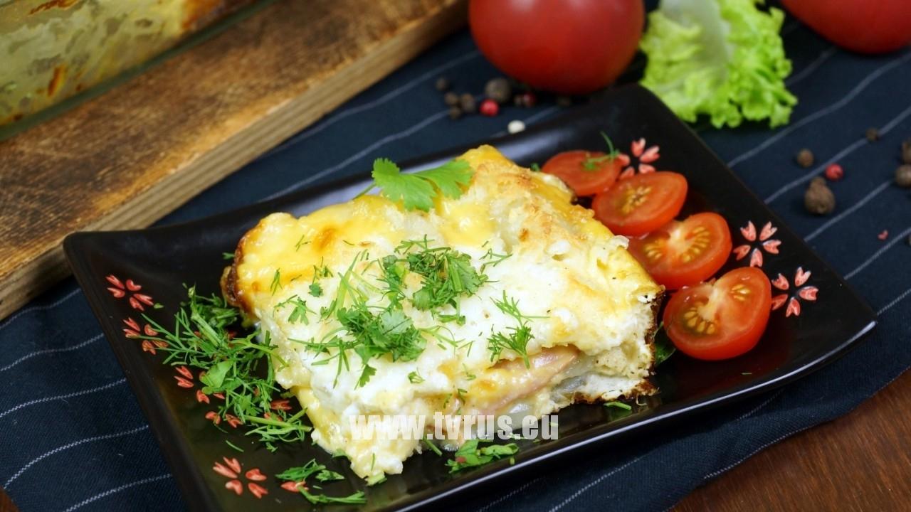 Затем слой ветчины разложить на картофель.