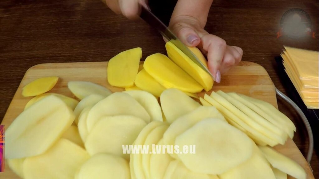 Нарезать острым ножом очищенный картофель на тонкие ломтики примерно в полсантиметра.