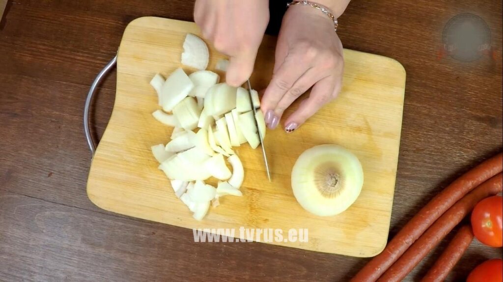 Пока картофель маринуется, займемся овощами. Репчатый лук нарезать на четверть кольца. Мелко шинковать лук не стоит, чтобы чувствовался потом в блюде.