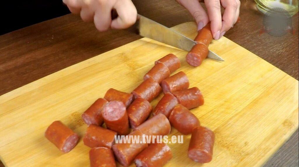 Баварские колбаски порезать на цилиндрики толщиной в 2 см. Колбаски можно заменить на копченый бекон или ветчину.