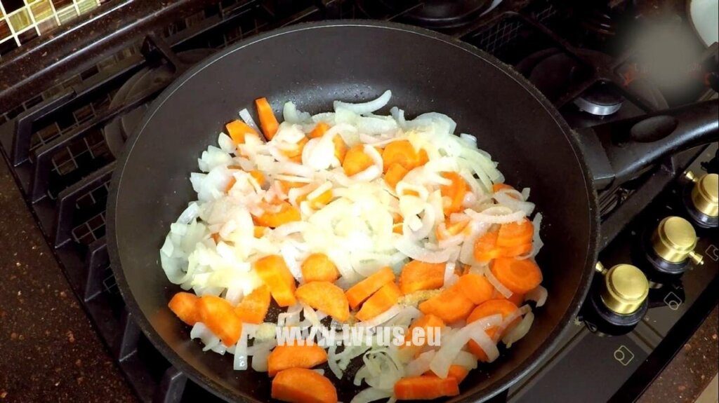 В глубокой сковородке разогреть растительное масло. Отправить туда лук, добавить щепотку сахара для карамелизации. Обжарить на среднем огне до румяного цвета буквально пару минут. Добавить морковь, перемешать и обжарить еще пару минут. Сюда же добавить соль по вкусу. У нас это 1 ч. л. соли без горки. Перемешать ингредиенты и поджарить еще пару минут на среднем огне. Овощи готовы, сделаем соус-заливку.