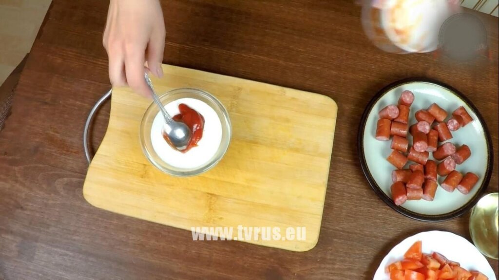 В чаше соединить сметану, томатную пасту или томатный кетчуп (На этом этапе можно поставить духовку на разогрев до 200 градусов).