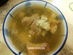 Пропустить через пресс очищенный чеснок и добавить его в горячий бульон. Дать постоять и процедить бульон через сито. Залить мясо и овощи.