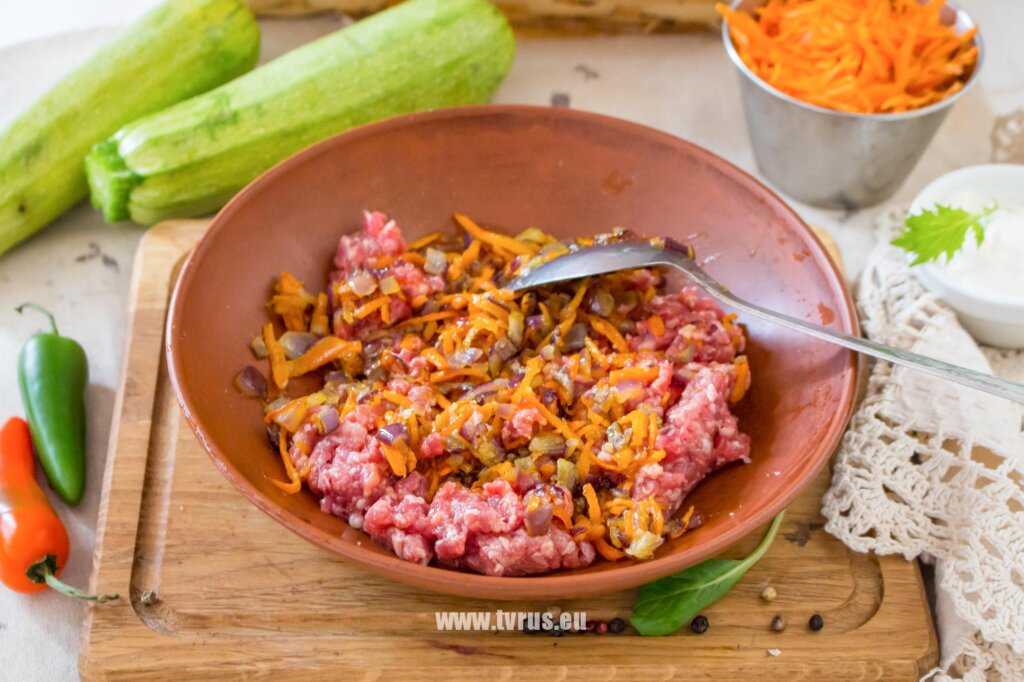 Подготовить начинку, для этого нужно поджарить на сковороде измельченную морковь с луком. Смешать мясной фарш с подготовленными овощами, добавить соль, специи и хорошо перемешать.