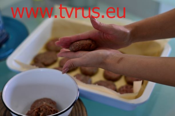 В глубокой емкости смешайте говяжий фарш, добавьте соду, гашенную лимонным соком, тщательно месите фарш в течение 10 минут до получения вязкой массы как тесто.