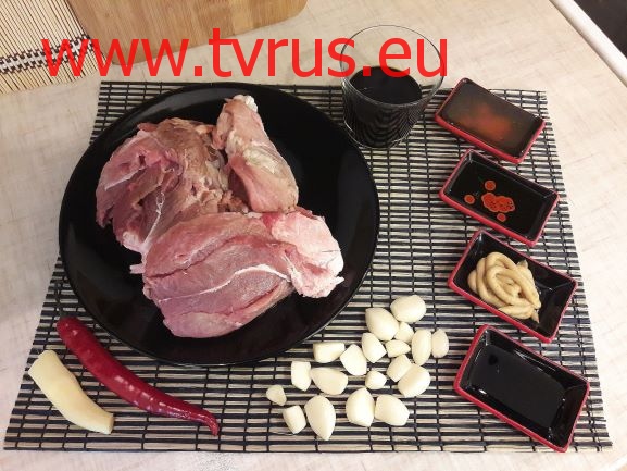 Удалить с кусков свинины лишний жир, плёнки и нарезать на небольшие тонкие брусочки. Острый перец очистить от семян и нарезать его, чеснок и имбирь небольшими произвольными кусочками.