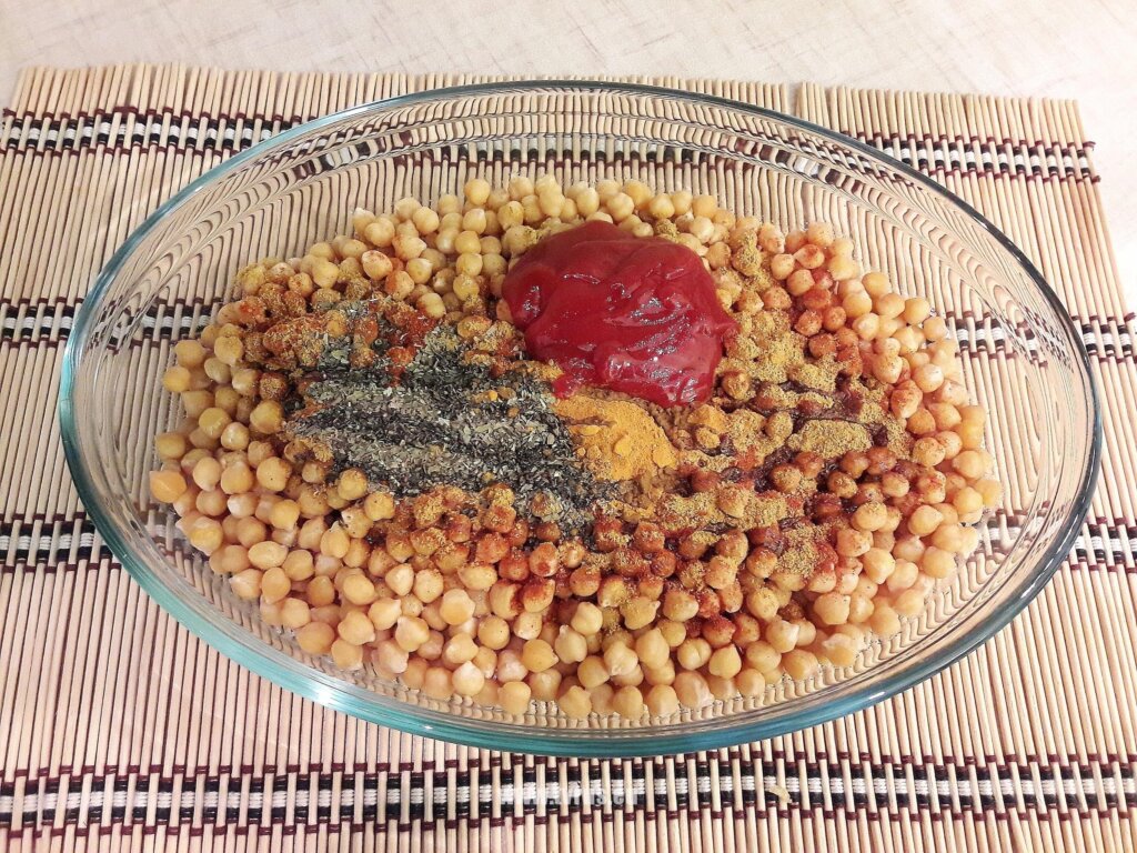 Выложить отваренный нут в форму для запекания. Добавить томатную пасту, все специи и соль по вкусу.