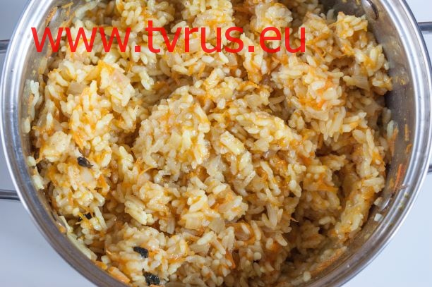 Рис промыть, и тщательно слить с него всю воду. Добавить рис в кастрюлю. Перемешать.