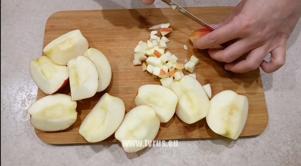 Яблоки помыть, вырезать сердцевину и нарезать мелкими кубиками.