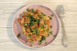 Жарить на среднем огне, пока овощи не станут мягкими, затем добавить порезанный кусочками картофель.